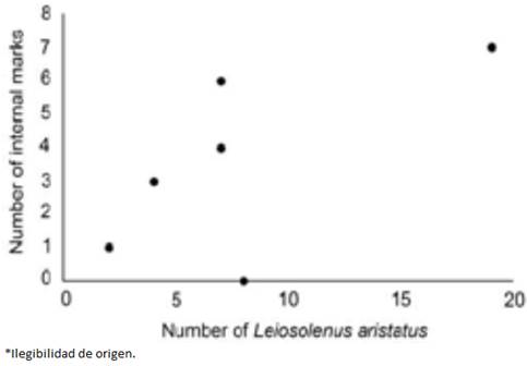 En este estudio, se observó que el bivalvo perforador L. aristatus ocasionó una serie de marcas en la concha interna de S. prismatica (Figura 4), por lo tanto, L. aristatus fue considerado endobionte. Se observó una posible asociación entre el número de marcas y abundancia de L. aristatus (Figura 5), con un valor de correlación de Spearman de 0.42 (P = 0.41).