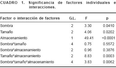 En cuanto al segundo experimento, resultaron significativos los tres factores probados: sombra, tamaño de semilla y tiempo de almacenamiento; además de la interacción entre el tamaño de la semilla y el tiempo de almacenamiento; y la triple interacción sombra x tamaño de semilla x tiempo de almacenamiento (Cuadro 1).