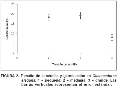 Existen dos enfoques contrastantes relativos al efecto del tamaño de la semilla en la germinación, en función del nivel de sombra del ambiente. En uno, se asume que las semillas grandes germinan mejor bajo sombra porque sus mayores reservas les ayudan a producir plántulas con hojas con mayor superficie foliar y más delgadas, para aprovechar la escasa luz que pasa por el dosel (Buckley et al., 1988). Bajo otro enfoque, las semillas grandes serían mejores para ambientes más abiertos, con relativa sequedad, pues la semilla cuenta con mayor reserva de humedad. Este último es el caso de los encinos del subgénero Leucobalanus (Zavala, 2004). La palma camedor parece ajustarse a la primera opción, pues aunque predomina la semilla pequeña que germina mejor sin sombra, la semilla mediana tuvo mayor germinación en los niveles más altos de sombra, y la semilla grande exhibió su mayor germinación en la condición de sombra del 70 %.