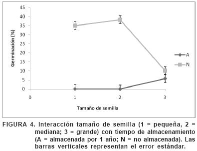Se halló una doble interacción en la cual la semilla almacenada por un año casi no germinó, escasa germinación de la semilla grande, los otros tamaños sin germinación, implicando la importancia de las reservas y humedad en las semillas al ser almacenadas. En la semilla no almacenada, las semillas pequeñas y medianas germinaron más que la semilla grande.