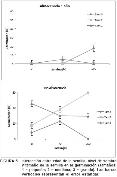 También se halló una triple interacción, la semilla grande en ambiente de 100 % de sombra tuvo la mayor germinación en la semilla almacenada. En el caso de la semilla no almacenada, las semillas pequeñas germinaron más sin sombra, las medianas mostraron relación directa en su germinación con respecto a los niveles de sombra (a mayor sombra mayor germinación) y la semilla grande germinó mejor con 70 % de sombra.