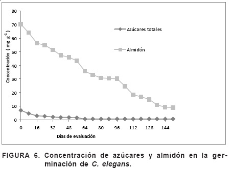 La principal reserva de carbohidratos encontrada al inicio del estudio fueron los almidones (70 mg·g1). Los azúcares se registraron en concentraciones pequeñas (8 mg·g1). Lo anterior puede relacionarse con el desdoblamiento de los primeros en los segundos para su utilización (dada que son convertibles entre sí), ya que se observó una paulatina reducción en la concentración de almidones hasta alcanzar 10 mg·g1 al cabo de cinco meses. La tasa de consumo de almidones durante el proceso de germinación de la semilla estudiada es de 12 mg·g1·mes1. Los azúcares alcanzaron niveles cercanos a 0 mg·g1 después de los cinco meses (Figura 6). La degradación y la movilización de los carbohidratos durante la germinación ha sido investigada en especies como el sorgo (Sorghum bicolor (L.) Moench.) y el palo de rosa (Aniba rosaeodora Ducke) (Correia et al., 2008; Souza et al., 2008), con reducción de almidones y azúcares hasta la emisión de la radícula y luego un aumento conforme esta última crece (Souza et al., 2008).