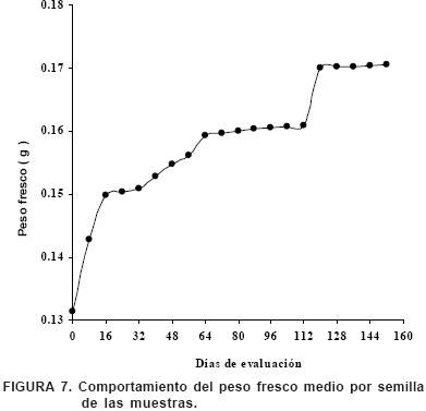 Típicamente, la respuesta del peso fresco de la semilla durante la germinación involucra inicialmente una rápida ganancia de humedad (imbibición), seguida por una larga meseta y finalmente una rápida ganancia de peso (Mei y Song, 2008). En la especie estudiada, se aprecia la rápida ganancia inicial de peso, seguida por un progresivo aumento de peso hasta el final de la evaluación (160 días) (Figura 7).