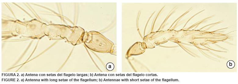 2(1') Setas del flagelo largas que gradualmente se adelgazan hacia el ápice, la longitud de la seta más larga varía de 2.25 a 3.50 veces el ancho de la base del flagelo (Fig. 2a).
