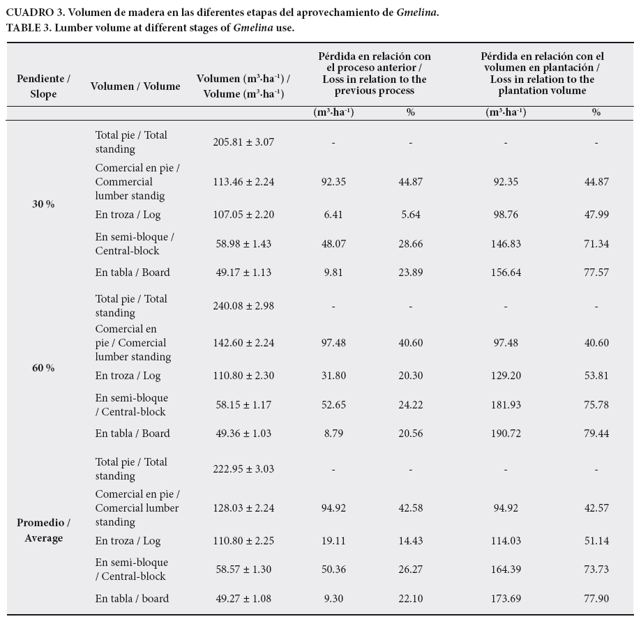 En el Cuadro 3 se muestra la evaluación cuantitativa del aprovechamiento de G. arborea. El volumen total en pie fue en promedio 222.95 m3·ha1 para las dos pendientes. La Figura 1 muestra las diferentes etapas del aprovechamiento de G. arborea. Es notable que la cuantificación del volumen comercial en pie disminuye en relación con el volumen total a un promedio de 128 m3·ha1 que equivale al 57.25%. Al realizar el troceo de los árboles, el volumen nuevamente disminuye de forma similar en ambas pendientes, teniendo una disminución al 49.08%. Con respecto a los dos tipos de pendiente, se tiene que en la pendiente de 60% hubo una pérdida mayor de volumen al trocear el árbol. Dicho resultado se debió a que al aumentar la pendiente se desarrolla un árbol de menor calidad en cuanto a su forma y, por tanto, al trocearlo es necesario eliminar las partes torcidas.