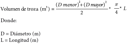 Una vez realizada la corta, los árboles fueron troceados a diferentes longitudes comerciales y se clasificaron por diámetro y longitud (Cuadro 1). El volumen de cada troza se calculó con la siguiente ecuación (Burbano, 1997):