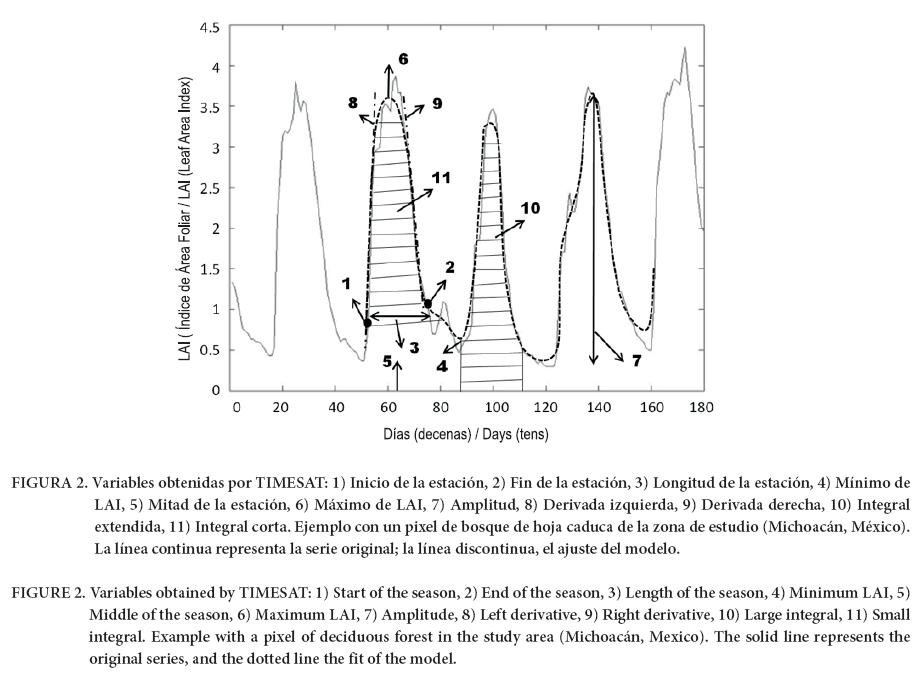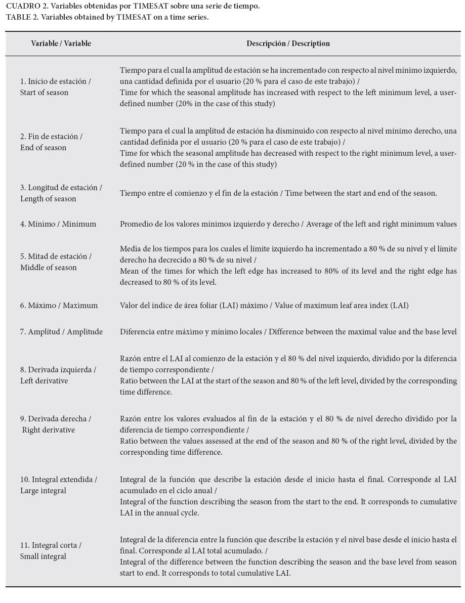 Caracterización fenológica de cada tipo de vegetación. Los datos de la serie de LAI del proyecto CYCLOPES del año 2000 se analizaron pixel a pixel con el algoritmo TIMESAT (Jönsson & Eklundh, 2004). Como resultado se obtuvieron 11 variables para cada pixel (Figura 2; Cuadro 2).