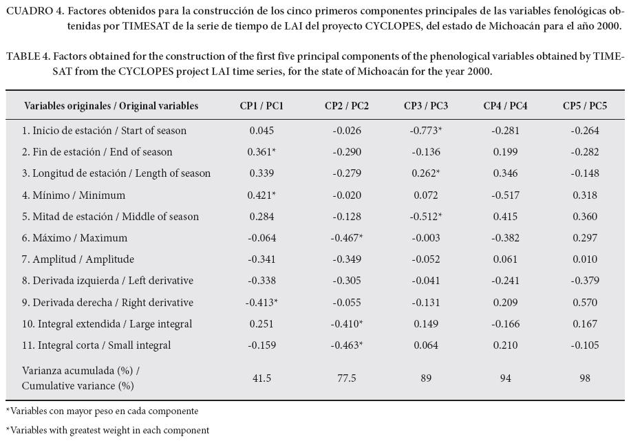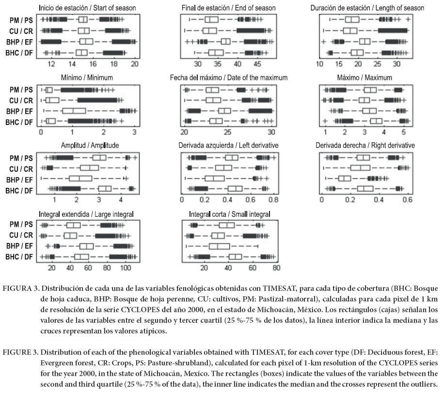 En el Cuadro 3 se presentan los valores tomados para los parámetros de ajuste de TIMESAT. Los píxeles con valores extraños en las variables de inicio de estación (mes 11) y derivadas izquierda y derecha (valores negativos) se eliminaron. La distribución de los valores de cada variable fenológica se obtuvo del conjunto de píxeles etiquetados con cada tipo de cobertura en el mapa de referencia INF2000.