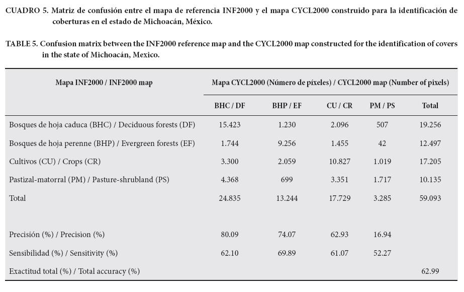 En el Cuadro 5 se muestra la matriz de confusión entre el mapa INF2000 y el mapa CYCL2000. El 63 % de los píxeles coinciden entre los dos mapas, lo que implica un desempeño modesto pero ligeramente superior al obtenido en mapas globales. Por ejemplo, el mapa GLC2000 (Global Land Cover), realizado también para el año 2000 considerando 27 tipos de cobertura, tuvo una precisión total de 68.8 %, siendo considerablemente más baja para paisajes heterogéneos en comparación con los sitios homogéneos (Pfeifer et al., 2011). Por otra parte, Valderrama-Landeros, Baret, y España-Boquera (2011) compararon mapas globales con un mapa de referencia (Comisión Nacional para el Conocimiento y Uso de la Biodiversidad [CONABIO] de México) del estado de Michoacán y obtuvieron una exactitud máxima de 45.6 %, correspondiente al mapa GLOBCOVER construido en el marco del GMES. Esto da una idea de la dificultad de clasificar la zona de estudio de manera automática, dada su heterogeneidad.