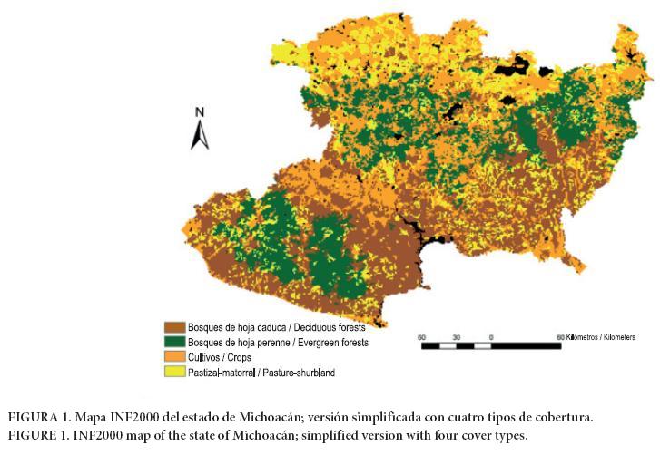 En el mapa INF2000 se contabilizan 36 tipos de vegetación en Michoacán, de los 46 totales en México (Miranda & Hernández, 1963; Rzendowsky, 1978). En el presente estudio se propone una versión simplificada de la leyenda original, con cuatro tipos de cobertura: bosques de hoja perenne (BHP, de coníferas y mixtos), bosques de hoja caduca (BHC, selva caducifolia), cultivos (CU) y pastizal-matorral (PM). El Cuadro 1 presenta la simplificación de los tipos de cobertura y en la Figura 1 se muestra el mapa correspondiente.