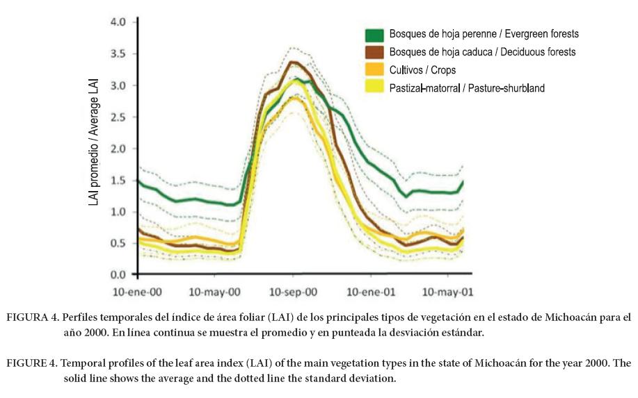 En los PM, el mínimo de LAI es el más bajo, pero el máximo es intermedio y la amplitud es alta. Los ritmos de incremento y decremento de LAI son los más altos después de los BHC. Los CU representan la cobertura más heterogénea, ya que incluyen desde agricultura de temporal hasta huertas de frutales. Los CU presentan un comportamiento fenológico muy parecido al de PM y es el tipo de vegetación que acumula menos LAI, la acumulación anual es similar a la de los BHP; los cuales inician la estación de crecimiento un poco más tarde y la terminan mucho después que los demás tipos de vegetación. Por tratarse de vegetación perenne, los BHP presentan un comportamiento estable a lo largo del año, con una estación de crecimiento poco marcada. En los BHC, por conformarse mayoritariamente de especies de hoja caduca, el mínimo de LAI es muy bajo; sin embargo, el máximo y la amplitud son los más altos de todos los tipos de vegetación. Esta vegetación presenta el ritmo de crecimiento más rápido al inicio de la temporada y un ritmo alto de decremento al final, junto con CU y PM. Todo esto explica que los BHC sean el tipo de vegetación que acumula más LAI a lo largo del año, lo cual se refleja en el valor de las integrales corta y extendida.