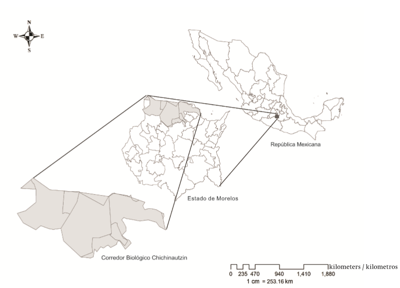 San José de los Laureles, municipio de Tlayacapán se ubica en el Área Natural Protegida, Corredor Biológico Chichinautzin al norte de Morelos, México (Figura 1). La vegetación se compone de bosque de pino, bosque de encino y relictos de selva baja caducifolia (SBC) (Miranda & Hernández, 1963). El clima es semicálido subhúmedo con lluvias en verano; la temperatura varía entre 18 y 22 °C con marcha tipo Ganges (Taboada, Reyna, & Oliver, 1992).