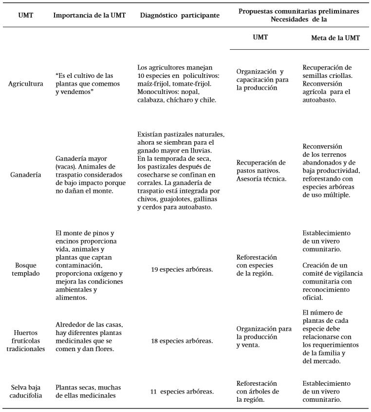 Con referencia al desarrollo sostenible, el colectivo lo describió como sinónimo de conservación, rescate y restauración de los "montes" dirigido a la recuperación de especies y los intercambios de la comunidad original. Las palabras clave fueron: reforestación, educación, maíz, frijol, eliminación de basura, ecología, siembra de tomate rojo o jitomate, y respeto. Con ellas, se construyó el enunciado "La solución de los problemas sociales y ambientales se debe apoyar en la educación para el respeto de la "ecología", porque así se facilitará la reforestación, el cultivo de maíz, frijol, picante amarillo, jitomate y la conservación del agua, para otras actividades como la ganadería y limpieza del pueblo". Este diagnóstico se enriqueció con dos UMT para sumar cinco, incluyendo algunas propuestas de conservación comunitaria (Cuadro 4), como lo sugieren Ross e Innes (2006).