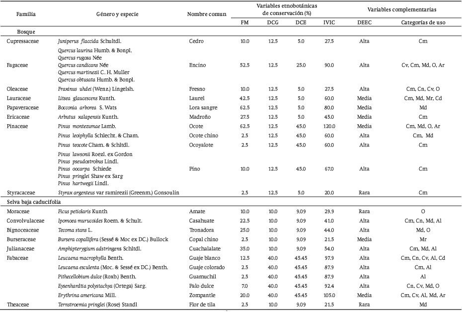 El bosque. El bosque y la SBC se consideran UMT en función del trabajo social que los habitantes desarrollan para apropiarse de sus componentes. En el bosque, la comunidad se apropia de 19 especies arbóreas. De acuerdo con el índice de valor de importancia cultural (IVIC), Pinus montezumae Lamb., destaca con 120 % y el género Quercus spp. con 90 % en sus cinco especies (Cuadro 5). De acuerdo con los resultados de las encuestas, los valores de la DEEC señalan que 75 % de las especies tienen disponibilidad alta, 20 % media y 5 % rara, la mayoría con categoría de uso múltiple.