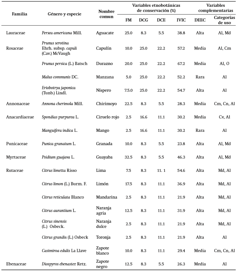 Los huertos frutícolas tradicionales. Los huertos agrupan 18 especies arbóreas; las de mayores IVIC son Prunus persica (L.) Batsch y P. serotina Ehrh. subsp. capuli (Cav.) McVaugh con 67.22 y 57.22 %, respectivamente (Cuadro 6), ambas con dos categorías de uso, destacando el alimentario. De acuerdo con la DEEC, 55.5 % de las especies fueron reconocidas con disponibilidad alta, 33.3 % con disponibilidad media y 11.1 % como rara.