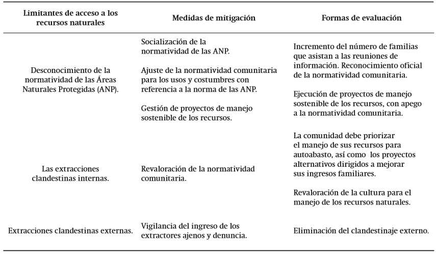 Cuadro 2. Límites de acceso a los recursos naturales, medidas de mitigación y formas de evaluación propuestas émicamente en San José de los Laureles, Tlayacapán, Morelos.