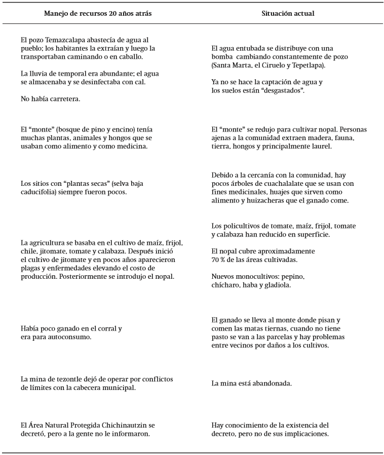 El primer taller permitió un acercamiento a la problemática de las UMT identificadas por la comunidad (Cuadro 1). Debido a que la comunidad se ubica en una ANP, las dificultades de acceso a los recursos se encontraron en la normatividad gubernamental, ante lo cual se plantearon medidas de mitigación y formas de evaluación (Cuadro 2). El resultado del segundo taller fue la percepción comunitaria del cambio de uso del suelo de forestal a agropecuario y la pérdida de la diversidad cultivada al predominar los monocultivos (Cuadro 3), coincidiendo con Ortiz-Ávila y Mancera (2008), quienes también abordan el manejo y conservación de los recursos naturales por grupos rurales.