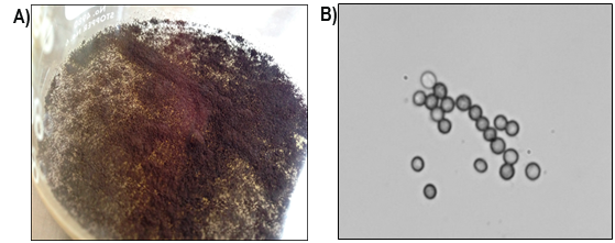 De acuerdo con las características macroscópicas, las colonias del hongo en PDA, después de siete días de crecimiento, fueron blancas a amarillentas (entre las primeras 24 a 48 h de cultivo), volviéndose negras y granulosas, con reverso amarillo a verde (Figura 1). Entre las características microscópicas destacan cabezas conidiales globosas de tono negro a café; conidióforos lisos de color café claro y conidios o esporas globosas. Las características mencionadas coinciden para el hongo Aspergillus niger Tiegh. 1867 (Abarca, 2000; Sáez, Flórez, & Cadavid, 2002).