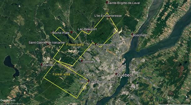 La provincia de Quebec está ubicada al este de la provincia de Ontario y la bahía de Hudson, al sur de Nunavut y el estrecho de Davis, al oeste de las provincias marítimas y Labrador, y al norte de varios estados de los Estados Unidos de América (Nueva York, Vermont, Nueva Hampshire y Maine). Más de 90 % del área de Quebec es parte del Escudo Canadiense. La ciudad de Quebec se encuentra en el valle de Saint-Lawrence, en la orilla norte del río Saint Lawrence, cerca del río St. Charles. El valle del río tiene un suelo fértil y arable, y la región es la más fértil de la provincia. El río St. Charles y el río Montmorency son fuentes de agua potable para la ciudad y se encuentran en el corazón del bosque. El área forestal de la ciudad de Quebec, que se considera parte del cinturón verde, cubre principalmente el anillo norte de la ciudad y afecta a Laurentian, La Haute-Saint-Charles, Charlesbourg, Beauport y una pequeña parte de las Rivières. La ciudad de Quebec abarca 45 400 ha y el área forestal ocupa 35 % de la ciudad, lo que representa aproximadamente 15 998.96 ha.