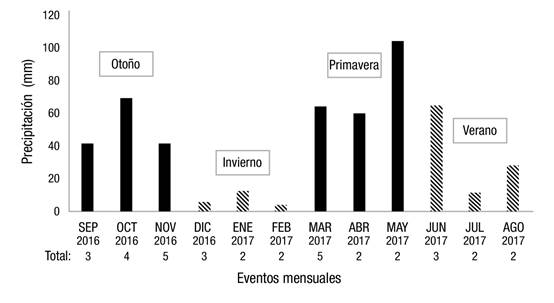 En el periodo septiembre 2016-septiembre 2017 se registraron 41 eventos de lluvia (Figura 1), en los cuales se acumularon 508.97 mm. Los meses de noviembre y mayo presentaron mayor cantidad de eventos, cada uno con cinco registros. Estacionalmente, la mayor precipitación se registró en primavera con 228.6 mm; en verano, otoño e invierno, la precipitación fue 152.39, 104.89 y 23.03 mm, respectivamente.