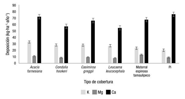 Pi accumulated 508.97 mm. Pd is the one that deposits more nutrients to the soil. The net contribution (Pd+Ef) indicated that Fe was the most deposited micronutrient with 2 938.29 g·ha-1·year-1, of which Casimiroa greggii (S. Watson) F. Chiang contributed 31.59 %. The macronutrient with greater presence was Ca with 319.31 kg·ha-1·year-1, being Acacia farnesiana (L.) Willd. the one that achieved greater flow of the mineral (22.66 %). pH and electrical conductivity were similar (Kruskal-Wallis, P > 0.05) in the three types of rainfall.
