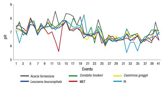 Durante el periodo de evaluación se observaron variaciones entre el pH de la Pi y de las Pd de las especies estudiadas. De acuerdo con los resultados, es razonable suponer que la lluvia, al fluir por las coberturas arbóreas, se recarga de sales minerales depositadas en el follaje, lo que ocasiona variaciones del pH en Pd respecto de Pi. El cambio más significativo se presentó en la Pd del dosel de A. farnesiana, con un promedio general de 7.19, con respecto a la Pi con valor promedio de 6.88, mientras que las Pd del MET y de L. leucocephala mostraron menos alteraciones.