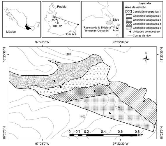 El estudio se realizó en el ejido Santa María Coapan, Tehuacán, Puebla, ubicado en la Reserva de la Biosfera Tehuacán-Cuicatlán (RBTC), entre las coordenadas geográficas 18° 23´ 26.85´´ - 18° 23´ 0.31´´ N y 97° 23´14.93´´- 97° 22´17.53´´ O (Figura 1), a una altitud promedio de 1 465 m.