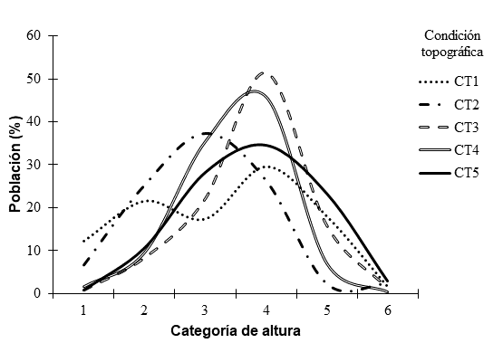 Las estructuras poblacionales de L. graveolens fueron diferentes (P < 0.05) entre las cinco condiciones topográficas. La curva tipo IV (Velasco-García et al., 2017) se presentó en la CT1 (Figura 2). Este tipo de curva tuvo un porcentaje bajo de plantas (<20 %) en las categorías de altura 1, 3, 5 y 6, y ligeramente mayor (20 a 30 %) en las categorías 2 y 4. Lo anterior puede deberse a restricciones bióticas y abióticas para la producción de frutos y semillas (Velasco-García et al., 2017), por lo que existe reclutamiento discontinuo en categorías de altura de mayor tamaño. La producción de frutos de L. graveolens depende de los polinizadores del género Melipona (Ocampo-Velázquez et al., 2009); la ausencia temporal de estos puede interrumpir la regeneración por semillas (Ocampo-Velázquez et al., 2009); además, la producción de frutos de L. graveolens solo ocurre en 11.4 % del total de las flores (Ocampo-Velázquez et al., 2009).