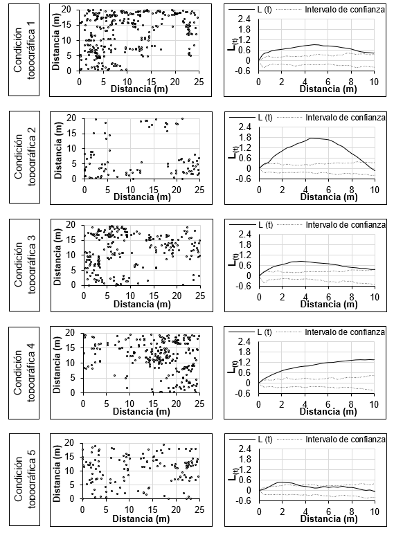 La distribución espacial aleatoria en la CT5 (Figura 3) probablemente se debe a la pendiente mayor que puede influir en la distribución y germinación de semillas en el suelo, las cuales comúnmente son dispersadas por el viento (Martínez et al., 2013). Es probable que, la mortalidad de las semillas o de las plántulas de algunas especies provoque mayor distanciamiento entre las supervivientes, lo que refleja un patrón menos agrupado (Vallejo & Galeano, 2009). La distribución espacial aleatoria contribuye con la multifuncionalidad relacionada con el ciclo de nutrimentos en una comunidad vegetal (Maestre, Castillo-Monroy, Bowker, & Ochoa-Hueso, 2012).