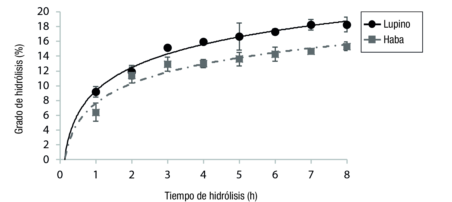 Varias investigaciones han demostrado que los hidrolizados enzimáticos contienen péptidos bioactivos, que son pequeñas secuencias de aminoácidos liberados de proteínas nativas (PN) por hidrólisis. Los hidrolizados proteínicos de soya, lenteja, frijol, garbanzo y chícharo han recibido mucha atención (Hernández-Álvarez et al., 2013; Roy, Boye, & Simpson, 2010). Por el contrario, hay muy pocos estudios relacionados con los hidrolizados de proteína de lupino (Lupinus gredensis), los cuales tienen un contenido de proteína comparable con el de la soya (Ayyash et al., 2019; Vioque, Alaiz, & Girón-Calle, 2012).