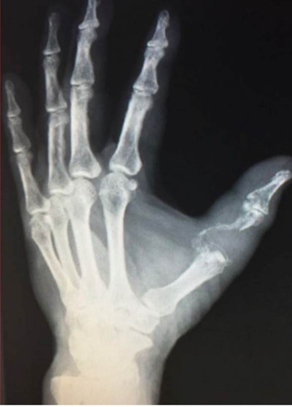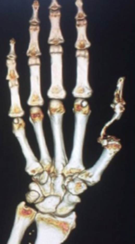 Paciente masculino de 64 años, originario y residente del estado de México, quien laboró en una planta termoeléctrica por 30 años. Antecedente de hipertensión arterial sistémica de 15 años, en tratamiento con amlodipino (5 mg/24 h por vía oral) y losartán (50 mg/12 h por vía oral); negó alergias y transfusiones; tabaquismo positivo desde los 15 años de edad (índice de 49) y alcoholismo desde los 20 años, de manera ocasional. Antecedentes quirúrgicos: colecistectomía abierta a los 46 años de edad y artroscopia en la rodilla derecha a los 52 años. Inició su padecimiento 12 meses antes de acudir al servicio médico, con dolor en el primer dedo de la mano izquierda; un mes previo a la consulta recibió tratamiento con diclofenaco (100 mg/12 h por vía oral) y paracetamol (500 mg/8 h por vía oral) por 14 días, sin lograr mejoría clínica, con persistencia del dolor y tratamiento intermitente. Acudió a revaloración en un hospital de segundo nivel, donde solicitaron estudios de laboratorios que reportaron: creatinina 1.7 mg/dL, examen general de orina con indicios de proteinuria, esterasa de leucocitos de aproximadamente 200, leucocitos 0-2 por campo y eritrocitos 70-80 por campo. Después de obtener la radiografía de mano izquierda (Figura 1) fue enviado al servicio de Traumatología y Ortopedia, quienes lo refirieron a la clínica de tumores óseos, donde llevaron a cabo estudios de laboratorios de control, con glucosa 78 mg/dL, creatinina 1.8 mg/dL, hemoglobina 14.6 g/dL, leucocitos 9.2 mil/mL, plaquetas 245 mil/mL, proteínas totales 6.8 g/dL, albumina 3.7 g/dL, ALT 19 UI/L, AST 23 UI/L, deshidrogenasa láctica 120 UI/L, fosfatasa alcalina 210 UI/L y calcio 10.2 mg/dL. Debido a los hallazgos tomográficos de la mano izquierda (Figura 2) se obtuvo una biopsia de la lesión y falange proximal, el reporte coincidió con carcinoma de células claras metastásico a descartar primario de riñón. El paciente ameritó la amputación del primer dedo de la mano izquierda. La tomografía abdominopélvica evidenció un tumor renal izquierdo T2b N0 M1, estadio clínico IV; el gammagrama óseo fue negativo para enfermedad ósea metastásica, por lo que se realizó nefrectomía radical izquierda, con hallazgos transoperatorios de riñón de 12 x 8 x 7 cm, 1 vena, 1 arteria, 1 uréter, sangrado de 700 cc, con resultado histopatológico de carcinoma de células renales variedad de células claras de 12 x 10 x 7 cm en el polo inferior, de alto grado Fuhrman 4, con patrón sólido, alveolar, acinar y papilar, con extensas áreas de necrosis, hemorragia, sin infiltración a la grasa perirrenal. Durante el seguimiento, a dos años del diagnóstico, el paciente permanece asintomático y la tomografía no reporta datos sugerentes de recurrencia local o a distancia.
