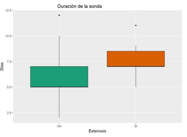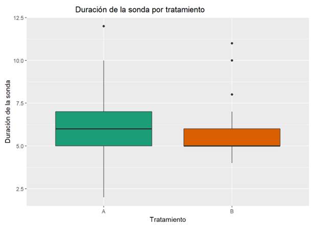 Figura 5 Diagrama de caja de la duración de la sonda en los pacientes divididos por el tipo de tratamiento