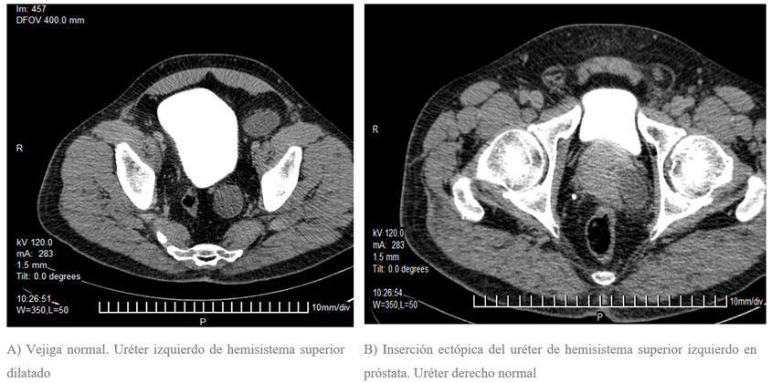 La tomografía axial computarizada contrastada del abdomen (TAC) confirmó el doble sistema excretor completo del RI. El sistema excretor superior mostró ureterohidronefrosis severa con afinamiento, destrucción y ausencia del parénquima renal. Los bolsones hidronefróticos ocupaban la mitad izquierda de la cavidad abdominal hasta la fosa ilíaca ipsilateral y contactaban con la pared abdominal (Figura 2). El uréter de dicho hemisistema se insertaba de forma ectópica en la uretra prostática (Figura 3). No se logró excreción del contraste del hemisistema superior mientras se comprobó excreción del inferior.