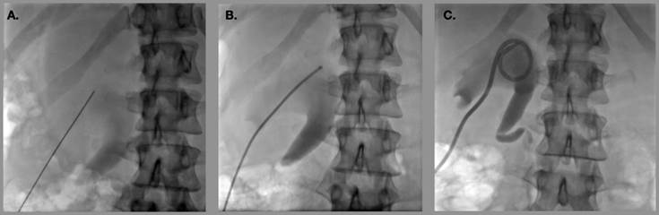 Se avanza aguja tipo Chiba o punta diamante a cálices mayores del polo inferior renal bajo guía sonográfica (A). Posteriormente se realiza recambio por sistema Neff y se opacifica el sistema colector (B). Finalmente se realiza recambio por catéter de nefrostomía (C).