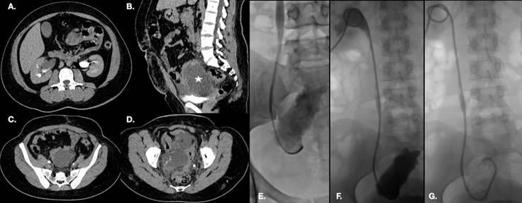 Se realiza tomografía computada con contraste intravenoso que muestra retardo en eliminación del riñón derecho (A), así como presencia de una colección de contenido líquido en hueco pélvico (estrella en B). Se identifica el trayecto ureteral bilateral hasta el tercio distal (C), con pérdida abrupta de la porción terminal del uréter derecho y fuga del medio de contraste a la colección descrita, lo cual es compatible con un urinoma (D). Se realiza tracto de nefrostomía y se avanza catéter multipropósito que evidencía la comunicación del uretero derecho con el urinoma (E). Se coloca estent nefroureteral (F) con el extremo distal en el urinoma, la J proximal en la pelvis renal y con extremo proximal del catéter conectado a una bolsa recolectora. En la imagen de control (G) se observa resolución del urinoma.