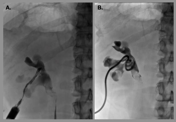 Con el fin de descomprimir la vía urinaria y obtener muestras para cultivo, los pacientes con sospecha de pionefrosis son sometidos a derivación urinaria mediante nefrostomía (Figura 8). Durante el acceso se debe cuidar administrar pequeñas cantidades de contraste, ya que al administrar mayor cantidad de líquido a la vía urinaria que ya se encuentra presurizada, se puede incrementar el riesgo de sepsis.9