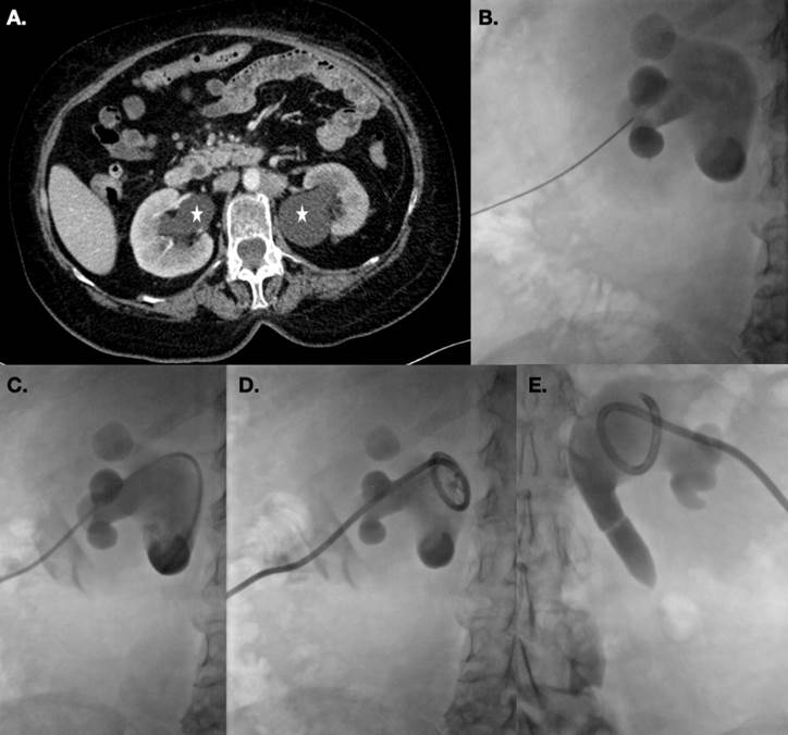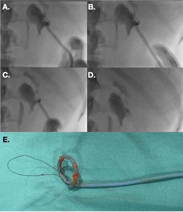 (A) Paciente masculino portador de nefrostomías por antecedente de hidronefrosis secundaria a invasión vesical de cáncer de próstata. Durante el primer recambio de catéter muestra paso del medio de contraste a vejiga. (B) Se avanza guía 0.035” a vejiga y se intercambia por catéter doble J (C). Posteriormente se dejan nefrostomías a derivación durante 48 horas y después cerradas durante 72 horas más. (D) Se realiza urografía en la que se observa adecuado paso del medio de contraste desde nefrostomías a vejiga, a través de catéteres doble J. (E) Se decide retiro de nefrostomías.