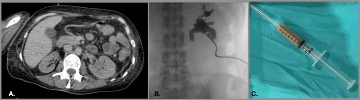 Figura 8. (A) Corte axial de tomografía computada en fase venosa que muestra estriación de la grasa perirrenal izquierda e incremento en las dimensiones de este. Ante la sospecha de pionefrosis posterior a caracterización por ultrasonido, se decide realizar nefrostomía (B) que en la imagen de control muestra defectos de llenado en el sistema colector. (C) Se obtuvieron muestras de apariencia purulenta que fueron enviadas a cultivo para determinar el tratamiento.