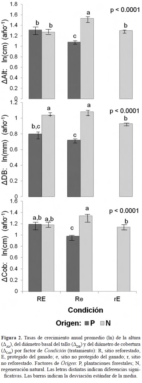 La relación entre número de anillos de crecimiento y número de verticilos fue rs = 0.91, P < 0.01. Las tasas de crecimiento anual de altura promedio (∆ALT), diámetro basal del tallo (∆DB) y diámetro promedio de cobertura (∆COB) fueron significativamente diferentes entre la regeneración natural y las plantaciones forestales en sitios con y sin ganado (F(2,2) = 58.07, P < 0.0001; F(2,2) = 58.6, P < 0.0001;F(2,2) = 62.31. P < 0.0001; respectivamente). Las mayores tasas de crecimiento anual de altura total y de diámetro promedio de cobertura se registraron en la regeneración natural de los sitios no protegidos del ganado (Re; Figura 2); el crecimiento anual del diámetro basal fue significativamente mayor en la regeneración natural de los sitios reforestados (RE y Re; Figura 2). Las tasas de crecimiento anual de altura total, diámetro basal y diámetro promedio de cobertura más bajas se registraron en las plantaciones forestales de los sitios no protegidos del ganado (Re). La regeneración natural de los sitios no reforestados y protegidos del ganado (rE) tuvieron tasas de crecimiento anual similares a las plantaciones forestales de los sitios protegidos del ganado (RE; Figura 2).