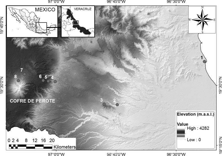 Study area. The study was conducted at eight study sites along an elevational gradient of ca. 82 km between 40 and 3,520 m a.s.l. on the eastern slopes of the Cofre de Perote, an extinct volcano of 4,282 m elevation in the central part of the state of Veracruz, Mexico (Figure 1). This region is located at the junction of the Trans-Mexican volcanic belt and the Sierra Madre Oriental, a mountainous area between 19° 25’ 5.7’’ and 19° 36’ 54’’ N, and 96° 22’ 36’’ and 97° 09’ 36.9’’ W. According to Lauer (1972), five climate zones can be found in the study area in combination with six forest types as classified by Miranda & Hernández-Xolocotzi (1963) (Table 1).