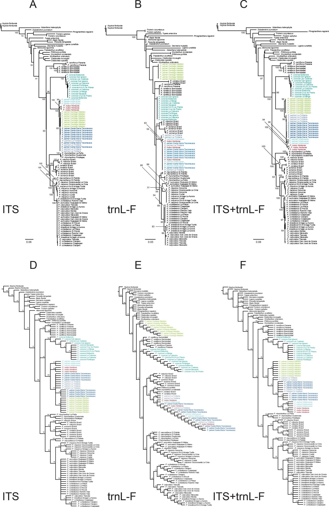 Phylogenetic analyses. Tree topologies for single (ITS, trnL-F) gene partitions of the BI analysis, summarizing the clade support for all methods, are shown in Figure 1. Figure 2 shows the tree topologies using maximum likelihood (ML; Figure 2A-B), and strict consensus maximum parsimony (MP; Figure 2D-E). The ITS dataset showed that Psittacanthus species are monophyletic (BI = 1.0 PP, MLBS = 100 % bootstrap support, MPBS = 100 % bootstrap support; Figure 1D, Figure 2A, D), and that individuals from Honduras, P. palmeri and P. sonorae are closely related, forming a well-supported clade (1.0 PP, 98 % MLBS, 99 % MPBS). In the trnL-F, Psittacanthus was not monophyletic and provided very low resolution within Psittacanthus, with unresolved relationships in the separate trees (Figure 1E, Figure 2B, E). Despite this, the trnL-F trees suggest that samples from La Trinitaria (Chiapas) provisionally determined as P. palmeri and those from Honduras are closely related to individuals of P. palmeri from Santa María Tecomavaca (Oaxaca) and individuals from Ixtlahuacan (Jalisco) by all three methods (BI, ML, and MP; Figure 1E and Figure 2B, E). However, these samples and those of P. palmeri from Santiago Matatlán arise from a polytomy. Although the level of resolution between the ITS and trnL-F datasets and phylogenetic methods differed, the relationships among individuals from Honduras, P. palmeri and P. sonorae were largely congruent in trees generated using ITS and the combined ITS+trnL-F datasets (Figures 1 and 2).