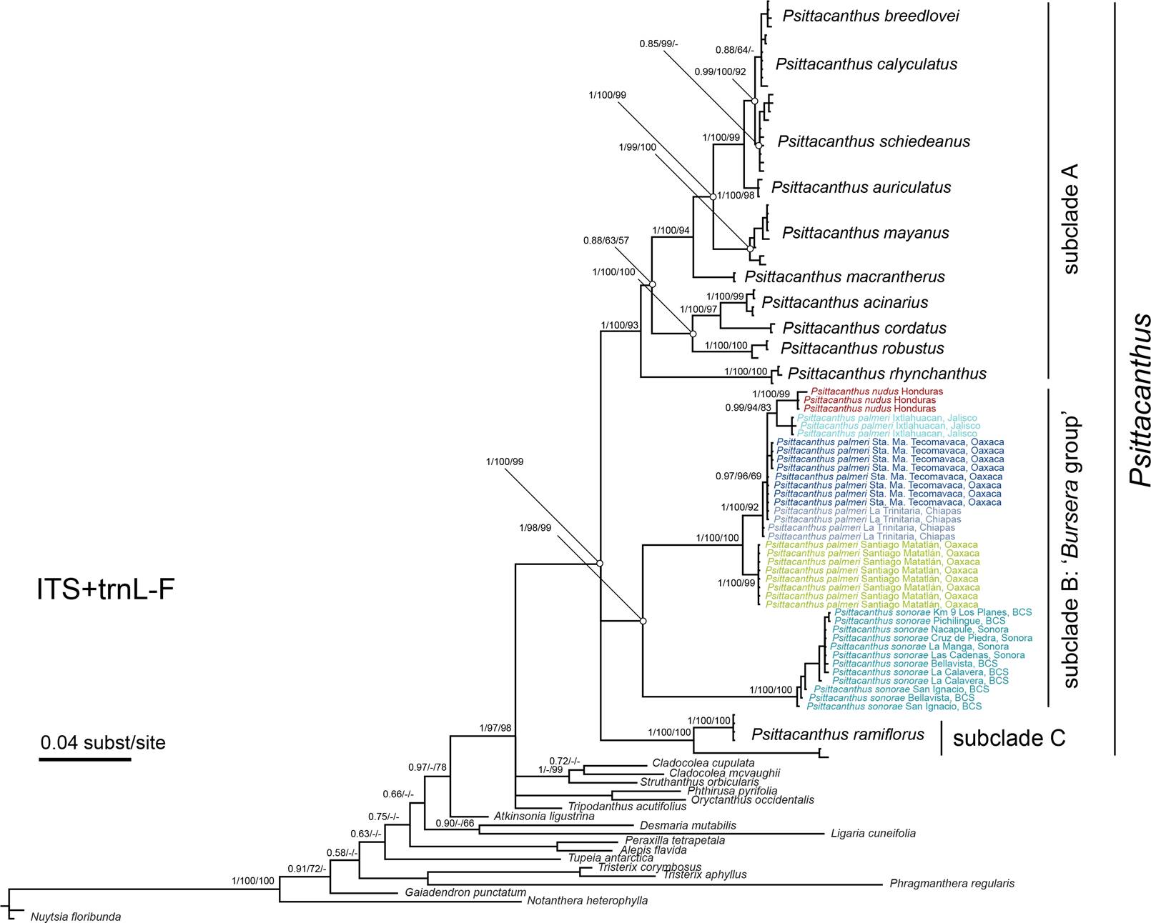 Psittacanthus lineages, phylogeny and the status of P. nudus. The three used analytical methods (BI, ML, and MP) of the combined ITS+trnL-F analyses resolved the conflicts between the single-gene trees, and topologies were more congruent with previous phylogenetic analysis of Psittacanthus, including the unresolved relationships between members of subclade C (P. ramiflorus and allies) and those in suclade B (‘Bursera group’) and subclade A (Ornelas et al. 2016, Pérez-Crespo et al. 2017, Licona-Vera et al. 2018). Based on this we considered the ‘ITS+trnL-F tree’ to be the best estimate of the phylogeny relationships among samples for further discussion and taxonomic considerations, until further phylogenetic analysis includes more species and markers, treating gaps (generally representing an insertion or deletion; i.e., indels) with the input sequence alignment as missing data and coded characters in phylogeny estimation.