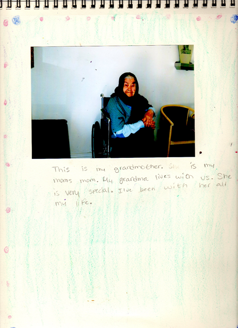 Los niños dejan ver la función importante que desempeñan los abuelos y otros miembros de su familia extensa. Las abuelas, por ejemplo, son las principales figuras que amortiguan las ausencias que los niños experimentan de los padres, y es común que migren a Estados Unidos para cuidarlos mientras los padres trabajan. Los abuelos, a través de pláticas e historias, recrean en la mente de niños y niñas un recuerdo de México: la historia, su origen.30 Nancy Sandoval lo muestra en la foto de su abuela, donde nos dice que su abuela es muy especial para ella.