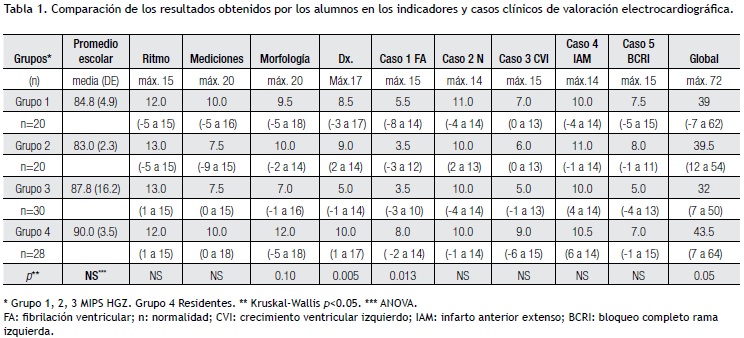 Material y método: Encuesta comparativa en 98 becarios, 70 internos de pregrado y 28 residentes de tres especialidades y un grupo de otras, en cuatro hospitales generales de zona. Variable dependiente: calificación obtenida en instrumento, conformado con 72 reactivos, con los siguientes indicadores: ritmo (15), medición (20), morfología (20) y diagnóstico (17), en cinco casos clínicos (fibrilación auricular, infarto agudo, hipertrofia ventricular izquierda, bloqueo rama izquierda y normalidad). Validación teórica, de contenido y constructo por tres cardiólogos, tres internistas y un médico familiar (técnica Delphi). Prueba piloto en 20 alumnos. Consistencia de 0.86 (Kuder-Richardson). Estadísticos: U de Mann-Whitney y Kruskal-Wallis (comparaciones intergrupales), Spearman y ANOVA.