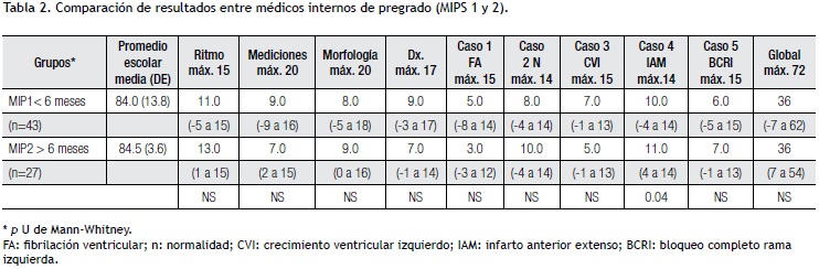 Cuando se comparan ambos grupos de MIPS, los resultados de (Tabla 2) "no sé" observan diferencias relevantes en los indicadores o en los casos clínicos. Cuando se comparan los grupos de residentes los resultados globales más altos, se obtienen por los residentes medicina interna y urgencias médico-quirúrgicas con una mediana global de 48 y las más bajas en otros p<0.03, con una mediana global de 31 (Tabla 3). Otras diferencias a favor de estos grupos se observan en ritmo, morfología y diagnóstico. No se encontró correlación entre los promedios universitarios y las calificaciones globales obtenidas.