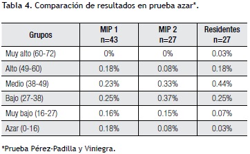 En los resultados explicados por azar obtenidos por la fórmula de Pérez-Padilla, Viniegra-Velázquez, se observó que en el grupo de residentes 3% de sus calificaciones pueden ser explicadas por el azar, 3% obtuvo un resultado muy alto mientras que la mayoría (44%) se encontró en nivel medio. Por otro lado, en los grupos de MIPS se obtuvieron resultados explicados por azar de 18% y 7.5% para MIPS con menos de seis meses y más de seis meses, respectivamente. Ningún alumno de este grupo MIP obtuvo un resultado muy alto y la mayoría se encontró en un nivel bajo 25% y 37%, respectivamente, para ambas promociones (Tabla 4).