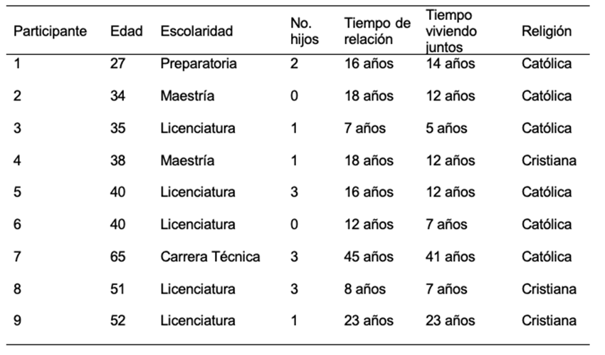Participaron nueve mujeres entre 21 y 65 años residentes del Valle de Toluca que, al momento del estudio, cohabitaban en una relación de pareja con al menos cinco años de duración. La selección se realizó de manera intencional; esta técnica permite seleccionar casos característicos de una población y se utiliza en escenarios en las que la población es muy variable y la muestra es muy pequeña (Otzen y Manterola, 2017). Referente al rango de edad, se consideró incluir mujeres que se encontraban en distintas etapas de la vida: tres adultas jóvenes (21-35 años), tres mujeres adultas de 36 a 50 años y tres adultas mayores (51-65 años) con la finalidad de tener un panorama más amplio sobre las experiencias de las mujeres de distintas edades. Se utilizó el criterio de saturación teórica a partir del muestreo intencional y la experticia del investigador en estudios cualitativos (Ventura y Barboza, 2017). Todas las participantes eran casadas, con estudios superiores, el promedio de hijos fue de 1.5, el tiempo promedio de relación fue 18.1 años y la religión que predominaba era la católica (ver Tabla 1).