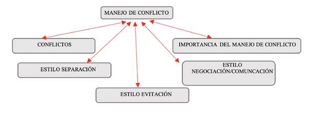 El eje de manejo de conflictos consideró las causas de los desacuerdos y las estrategias de solución (Cruz et al., 2018). Se utilizaron las categorías tipo de conflictos, estilos empleados (separación, evitación, negociación/comunicación) y la importancia del manejo del conflicto.