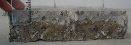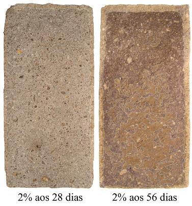 Os resultados do estudo de Mota (2011) também permitiram observar que há fixação de cloretos com o passar do tempo. Para uma argamassa produzida com 2% de cloretos em relação à massa de cimento, a região branca (que indica onde há cloretos livres) se modificou. Apesar de não haver uma frente de penetração de cloretos, já que a contaminação nessa etapa do estudo de Mota (2011) foi interna, é possível observar na Figura 4 que a área contaminada por cloretos, indicada pela alteração da coloração para esbranquiçado ao se aspergir nitrato de prata, diminuiu. Ou seja, os cloretos estariam deixando de ser livres para se combinar com o C3A. Vale salientar que as bordas claras na Figura 4 são relativas ao efeito da carbonatação.
