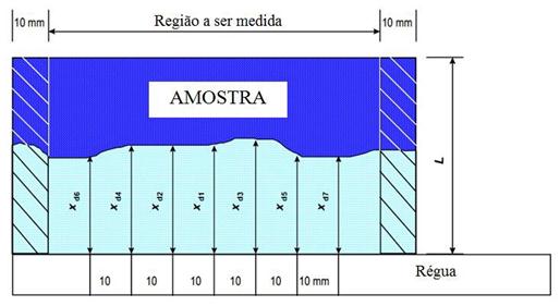Como a penetração de cloretos não é uniforme, a NT BUILD 492 (2000) recomenda realizar sete medidas a cada 10 mm, sendo o resultado a média entre todas elas (Figura 3). No caso de impossibilidade de leitura pela presença de agregados, deve-se alterar o ponto de medição ou ignorar esta profundidade se houver outras cinco válidas.